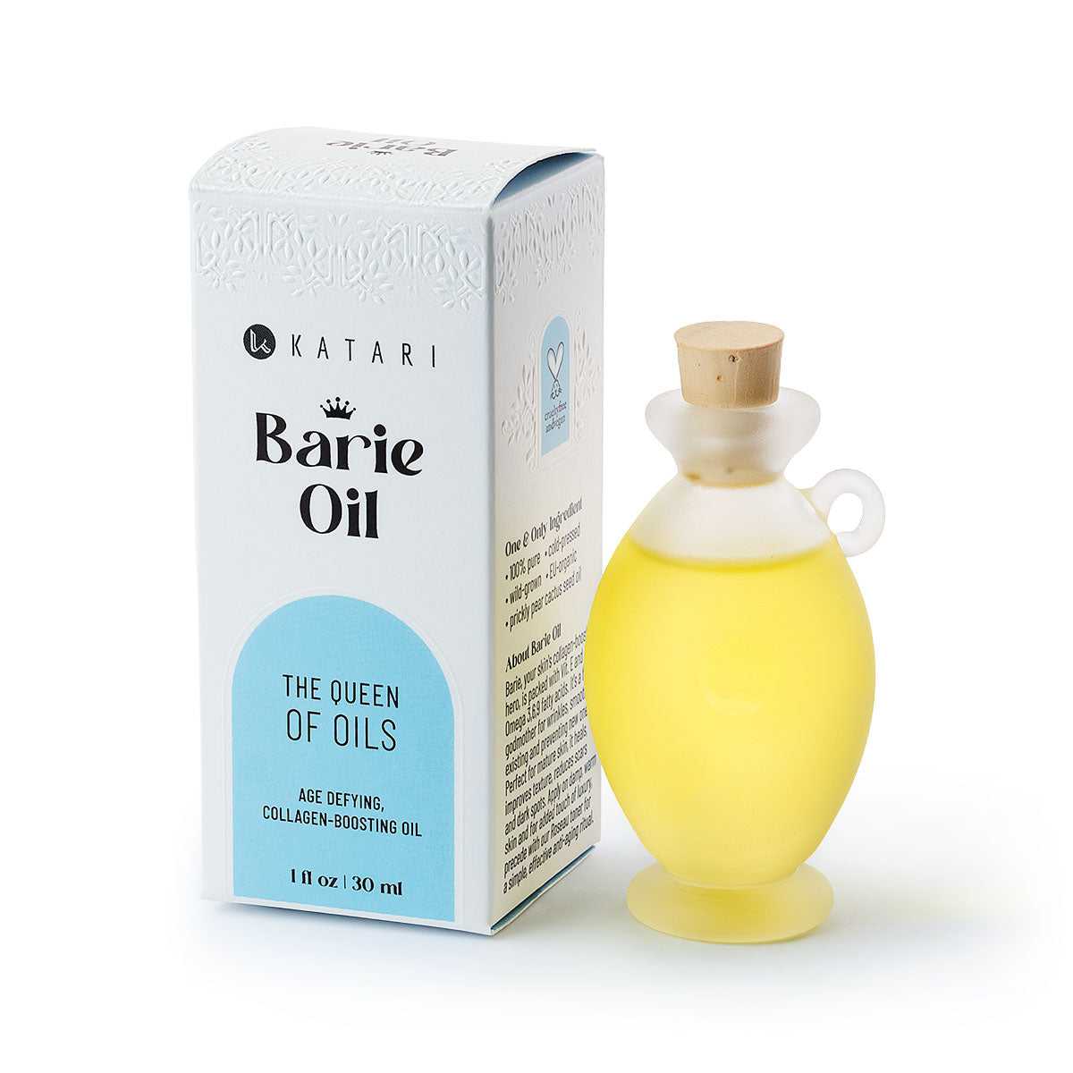 Katari Barie Oil is pure prickly pear cactus seed oil. It is the rarest, most potent natural pro-aging oil. It is the only plant oil known to help rebuild collagen, while delivering the highest levels of natural Vitamin E, plus Vitamins C and K for brightening, hydration, and under-eye care.